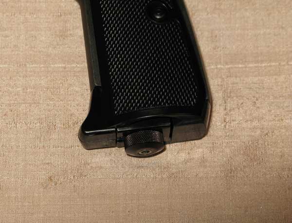 Umarex Walther PPK with knurled, oil blued butt screw assembly, closeup
