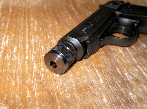 Umarex Walther PPK with oil blued muzzle weight, three quarter view