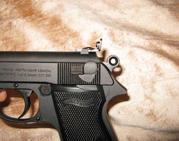 Umarex PPK with replacement adjustable rear sight fitted, full forward position