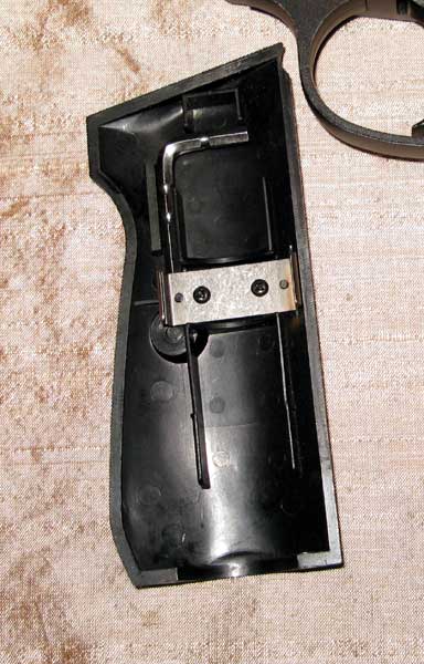 Umarex Walther PPK showing concealed key for butt assembly insidel L grip plate, closeup